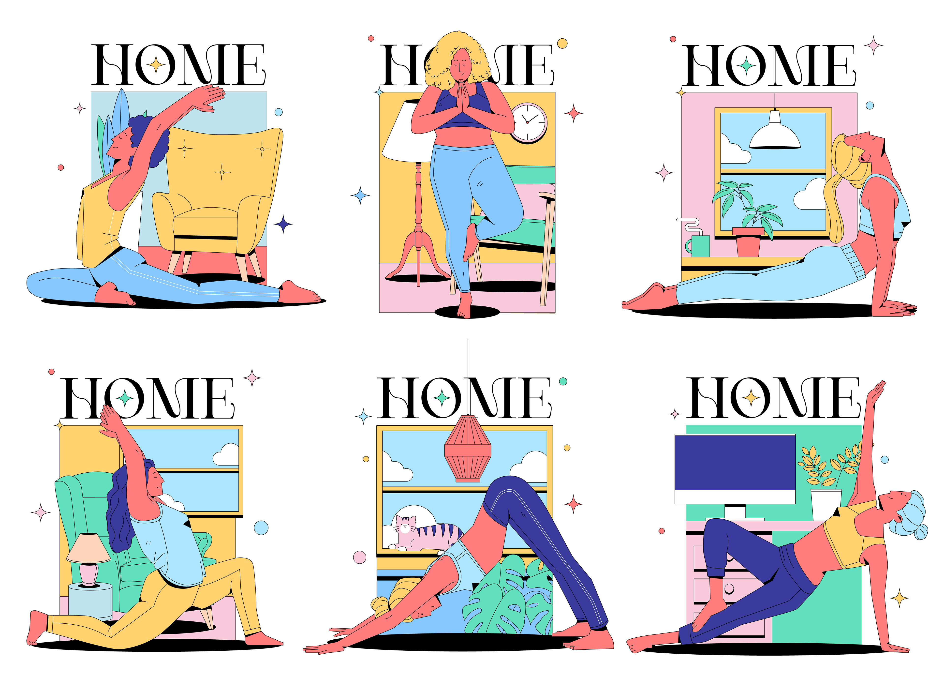 Desde o começo de 2021 tenho criado alguns vetores para o site Freepik. Desde então, tenho desenvolvido minha própria biblioteca vetorial, então decidi compilar alguns deles para criar um projeto pessoal que chamei de "Home". Essa série ilustra a prática do Yoga em casa.